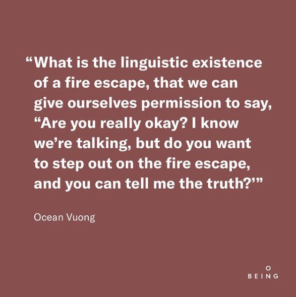This On Being with Krista Tippet podcast episode with poet, novelist and MFA professor Ocean Vuong, recorded live in NYC in March 2020 just before lockdown. I’m honestly just entering the podcast scene so am no pro, but this is my favorite episode of all time (Samar, I owe you one for sending!). I was stunned. I hit play again as soon as it ended. It’s so, so sweet. The tenderness and emotion in Ocean’s voice, his eloquence on topics as difficult as the Vietnam war and his uncle’s suicide, his hope for language, wisdom on how it’s failed us, and how we can recreate it again. A pristine example of strength in vulnerability.