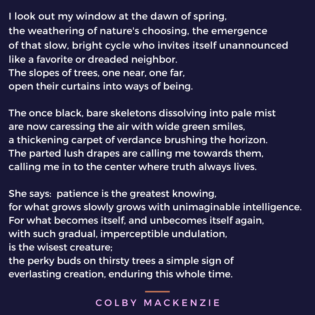 Through this lens, I can understand patience as another ever-evolving, lifelong endeavor of growth. The same infinite, beautiful process that always surrounds us in nature. The holding of the paradox that we are always changing and we are whole as we are right now. Over and over again.